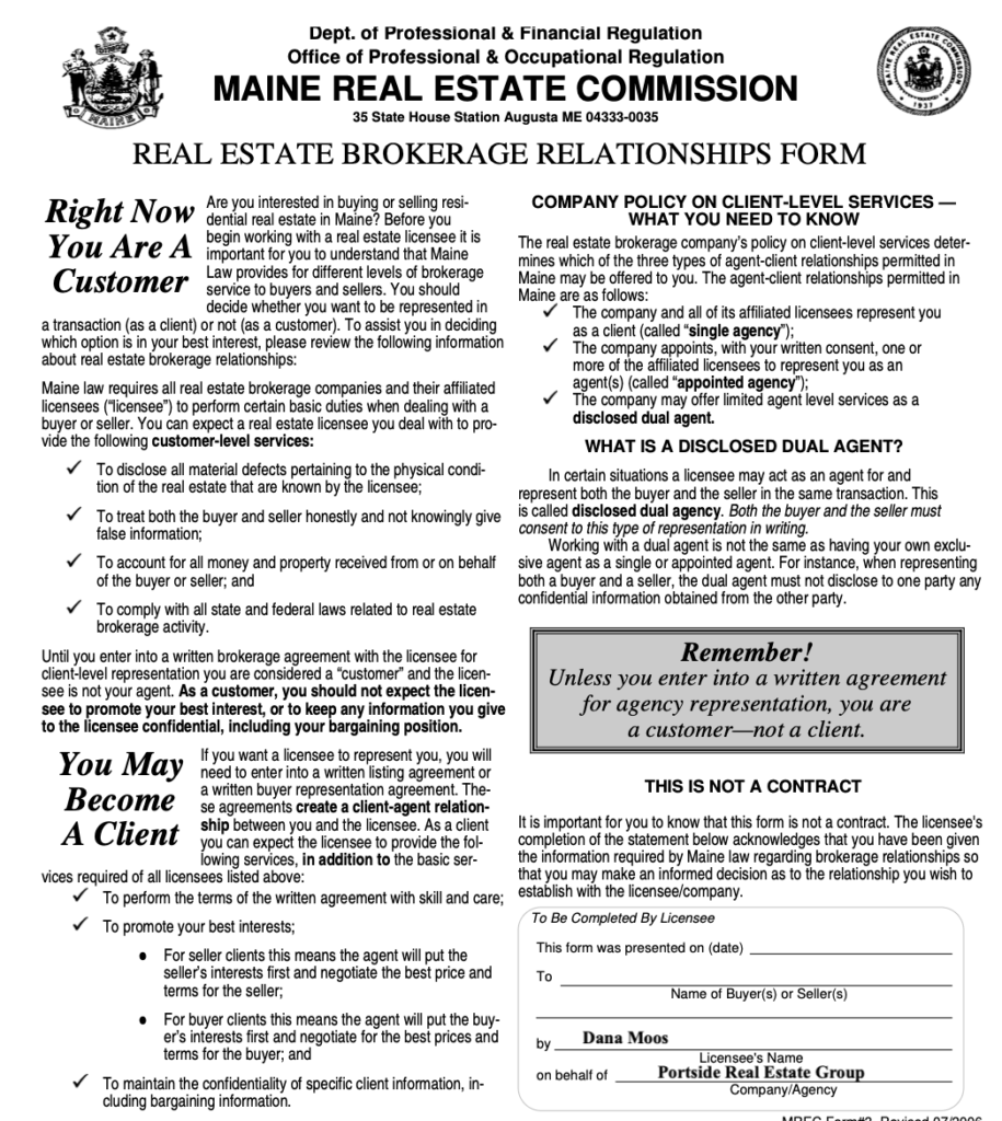 You will receive the “Real Estate Brokerage Relationships” form required by the Maine Real Estate Commission.