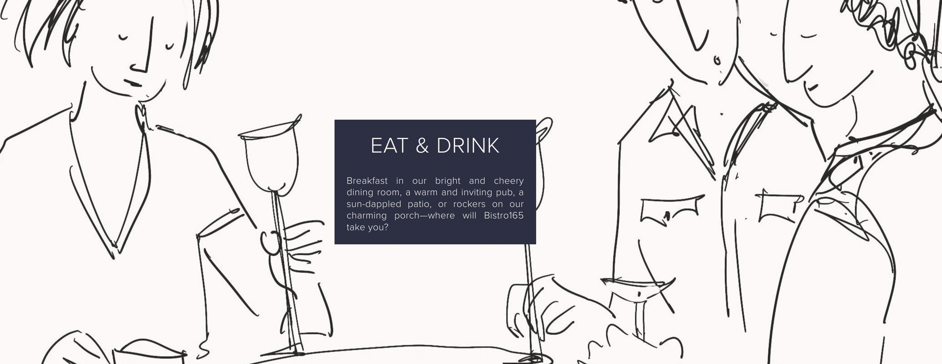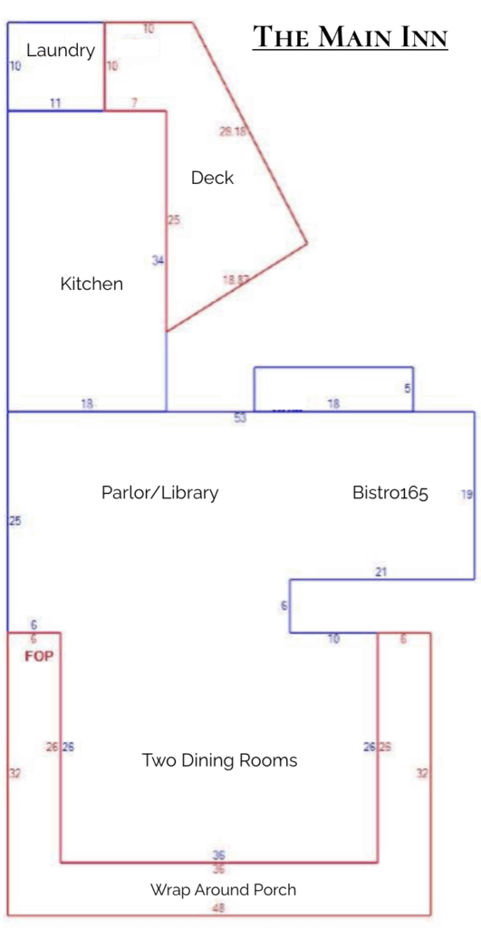 The Main Inn boasts a large dining room, parlor, Bistro165 (for guests and open to the public), and 8 generous guest rooms. This building is also home to a full working kitchen for preparing breakfast, and food for PUB165, as well as an office, laundry facilities, pantry and storage.