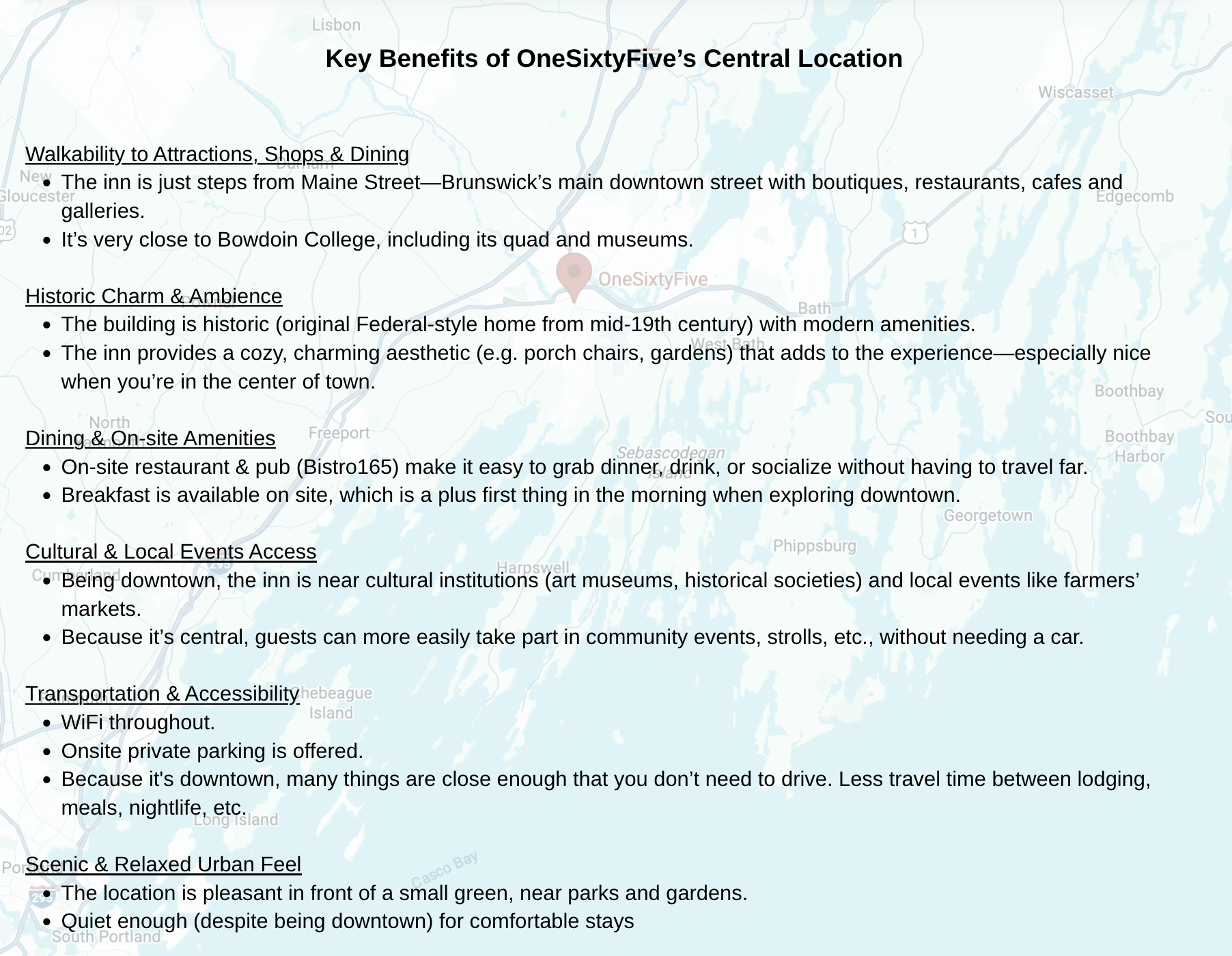 - Bowdoin College and local businesses frequently require lodging and event space — ideal for developing long-term contracts and repeat group business.